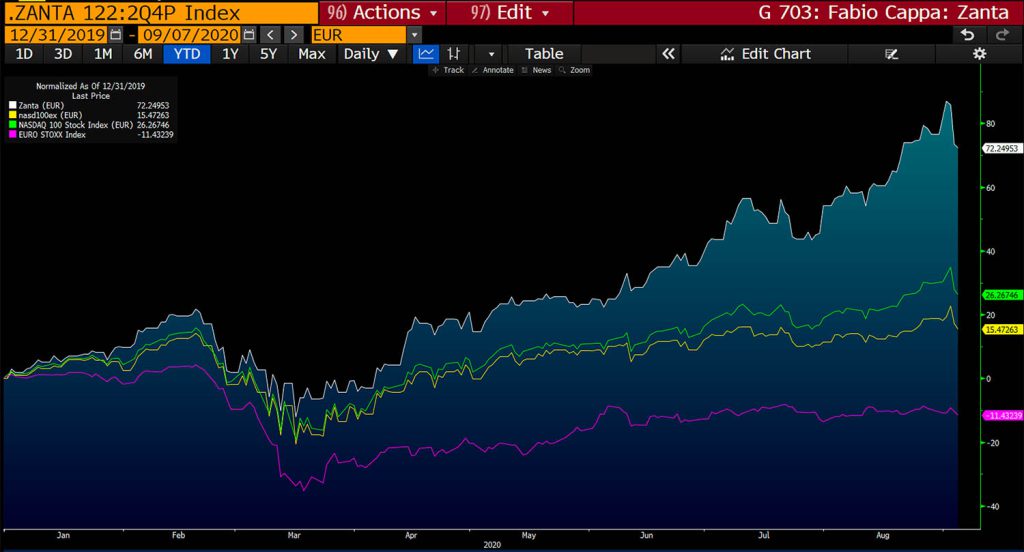 Nel grafico allegato a queste righe, rettificate per il cambio Eur-Usd, in quanto un investitore italiano ha generalmente subito la flessione del dollaro sull’euro, ho creato lo “Zanta Index” (linea bianca) che da solo da Gennaio 2020 ha registrato una performance da capogiro del 72,25%, questo parametrando proporzionalmente i pesi che i 5 titoli hanno nel Nasdaq 100.