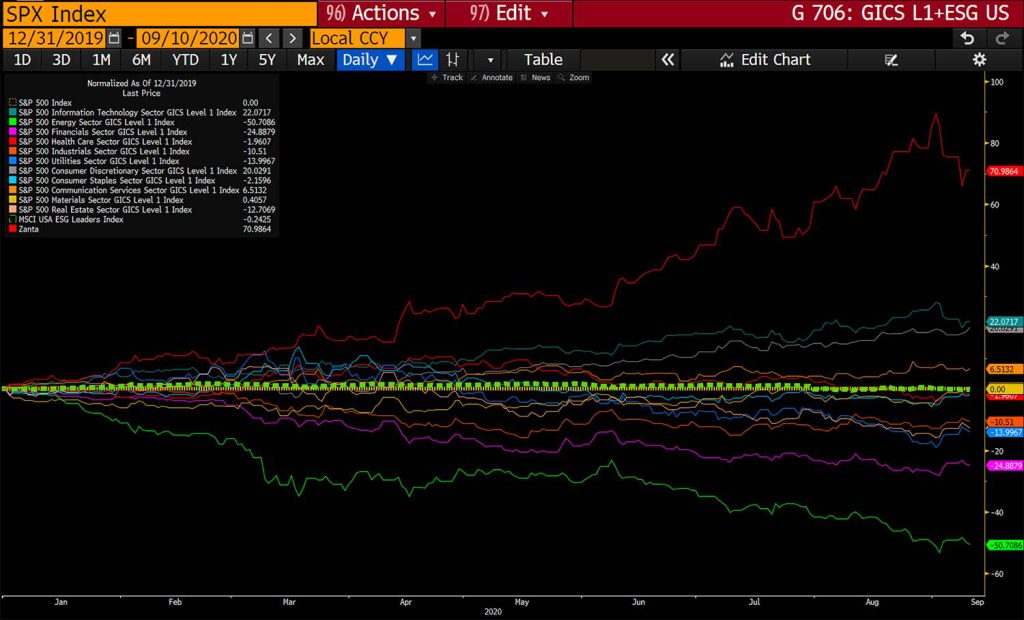 Ad aver sempre sovraperformato in questo 2020, sono stati i tecnologici (color ciano per il quale vedrete un +22,07% alla quale si somma la performance dello S&P 500), i Consumi Discrezionali (in grigio scuro a +20,03% sull’indice) e le Comunicazioni (in arancione con +6,51% sull’indice).